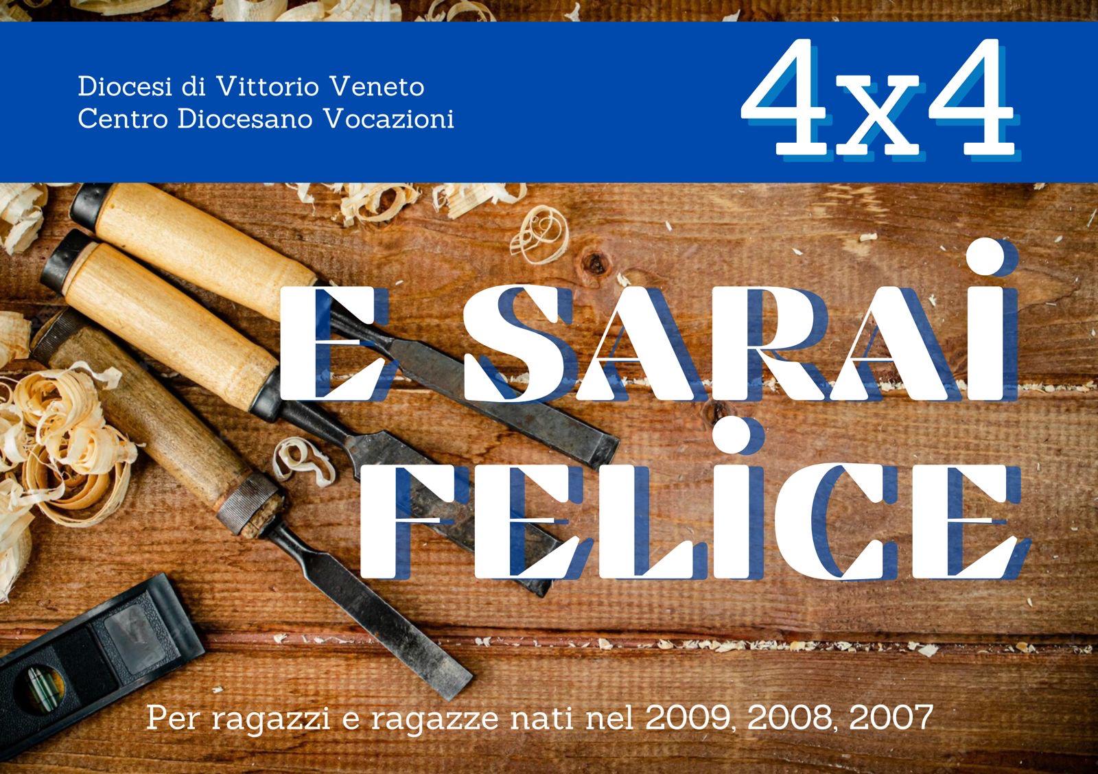 Il 4×4 è un cammino promosso dai preti giovani della diocesi in sinergia con il Centro Diocesano Vocazioni rivolti a ragazzi e ragazze dalla terza alla quinta superiore. Il percorso è formato da quattro incontri durante l’anno, dalla durata di quattro ore ciascuno, più una proposta estiva. È un’opportunità per dare voce alle domande che si portano nel cuore, per condividerle con i propri coetanei e per lasciare che la parola del Vangelo possa illuminare la propria vita, anche grazie all’esperienza dell’accompagnamento di un sacerdote.
